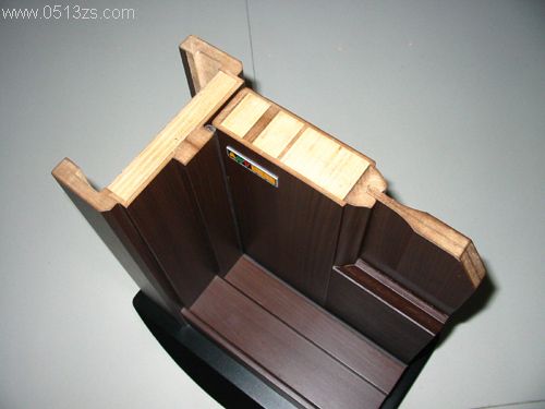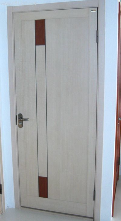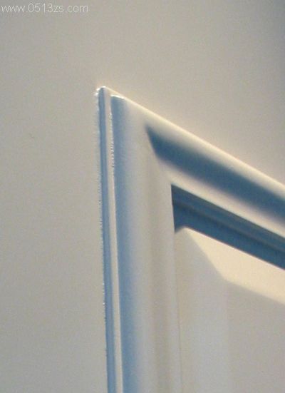 另一类门安洋称之为工艺门,我看其实就是模压门,这种门有三层构层,内层是集成材,沈老板介绍说这种板是将松木等木材旋切后再胶合而成。中间是一层密度板,最外层贴PVC膜,沈老板介绍这种膜表面有一层耐磨层,类似于强化地板表面的三氧化二铝,用尖物划,烟头烫都没事。至于膜的产地沈老板说及他也不了解。